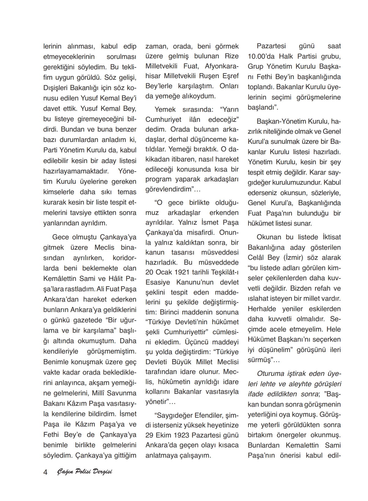 “O gece birlikte olduğumuz arkadaşlar erkenden ayrıldılar. Yalnız İsmet Paşa Çankaya’da misafirdi. Onunla yalnız kaldıktan sonra, bir kanun tasarısı müsveddesi hazırladık. Bu müsveddede 20 Ocak 1921 tarihli Teşkilât-ı Esasiye Kanunu’nun devlet şeklini tespit eden maddelerini şu şekilde değiştirmiştim: Birinci maddenin sonuna “Türkiye Devleti’nin hükûmet şekli Cumhuriyettir” cümlesini ekledim. Üçüncü maddeyi şu yolda değiştirdim : “Türkiye Devleti Büyük Millet Meclisi tarafından idare olunur. Meclis, hükûmetin ayrıldığı idare kollarını Bakanlar vasıtasıyla yönetir”…