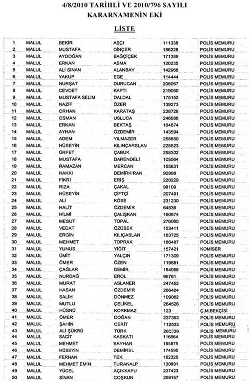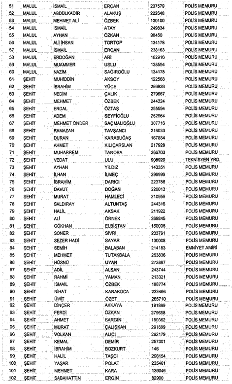 Ekli listede adları yazılı Emniyet Genel Müdürlüğü mensuplarından malul